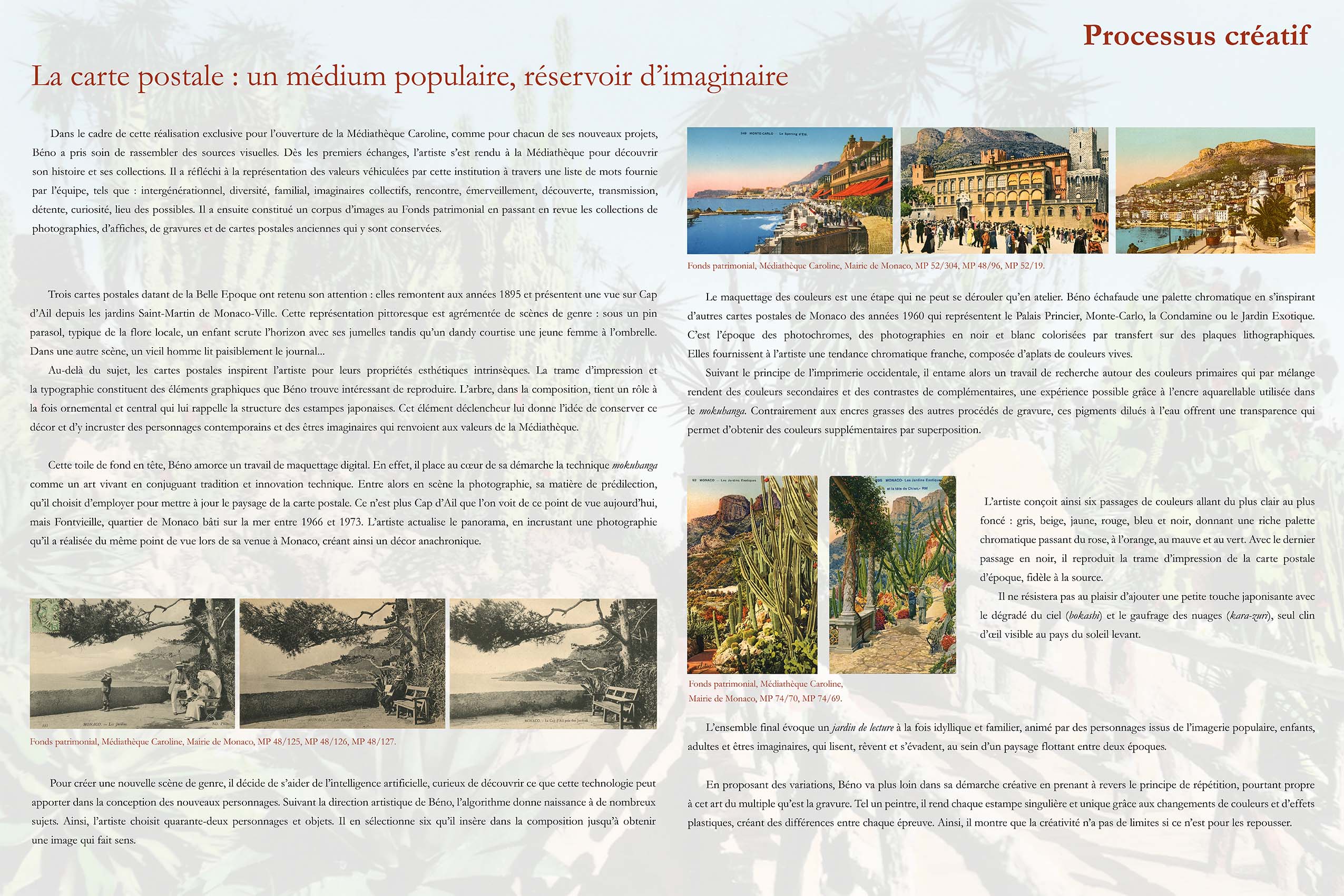 Trois cartes postales datant de la Belle Epoque ont retenu son attention : elles remontent aux années 1895 et présentent une vue sur Cap d’Ail depuis les jardins Saint-Martin de Monaco-Ville. Cette représentation pittoresque est agrémentée de scènes de genre : sous un pin parasol, typique de la flore locale, un enfant scrute l’horizon avec ses jumelles tandis qu’un dandy courtise une jeune femme à l’ombrelle. Dans une autre scène, un vieil homme lit paisiblement le journal... Au-delà du sujet, les cartes postales inspirent l’artiste pour leurs propriétés esthétiques intrinsèques. La trame d’impression et la typographie constituent des éléments graphiques que Béno trouve intéressant de reproduire. L’arbre, dans la composition, tient un rôle à la fois ornemental et central qui lui rappelle la structure des estampes japonaises. Cet élément déclencheur lui donne l’idée de conserver ce décor et d’y incruster des personnages contemporains et des êtres imaginaires qui renvoient aux valeurs de la Médiathèque.