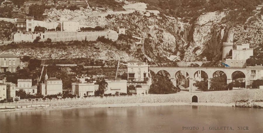 On remarque les casemates sur le flanc du Rocher au-dessus de l’entrée inférieure de la Rampe. Au fond, les terrasses d’oliviers à la Condamine.